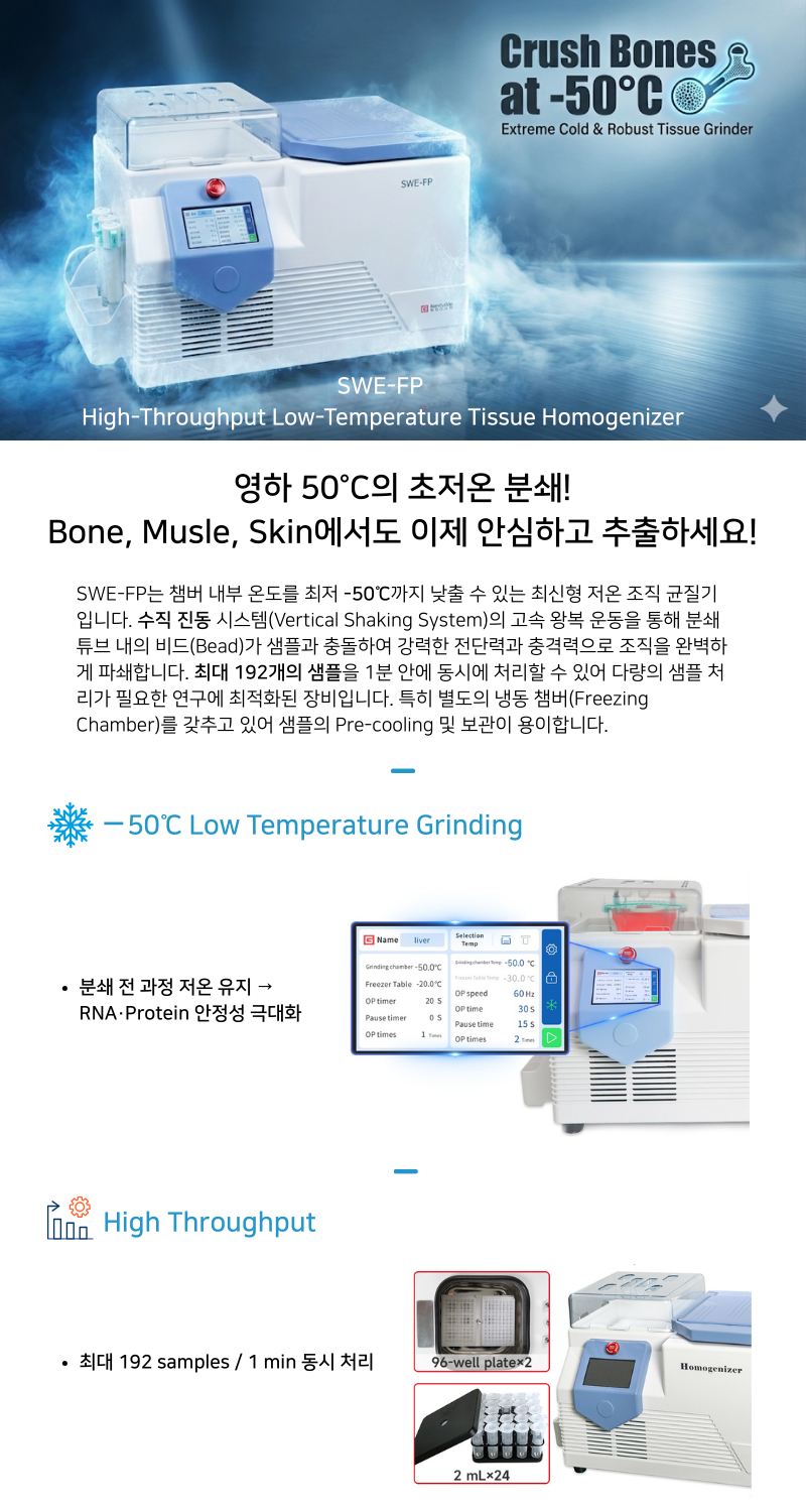 영하 50°C의 초저온 분쇄! Bone, Musle, Skin에서도 이제 안심하고 추출하세요! Tissue Homogenizer SWE-FP