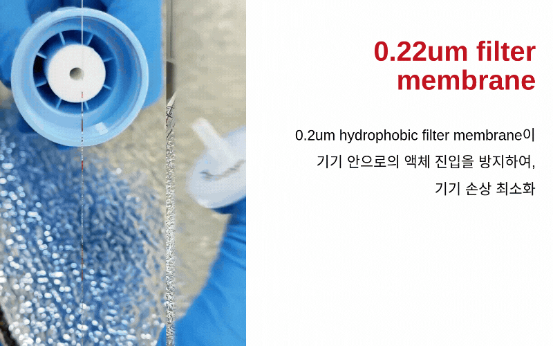 0.22μm 기공 크기의 소수성 필터 멤브레인과 호환되어 역류를 방지하고 기기를 보호할 수 있습니다.