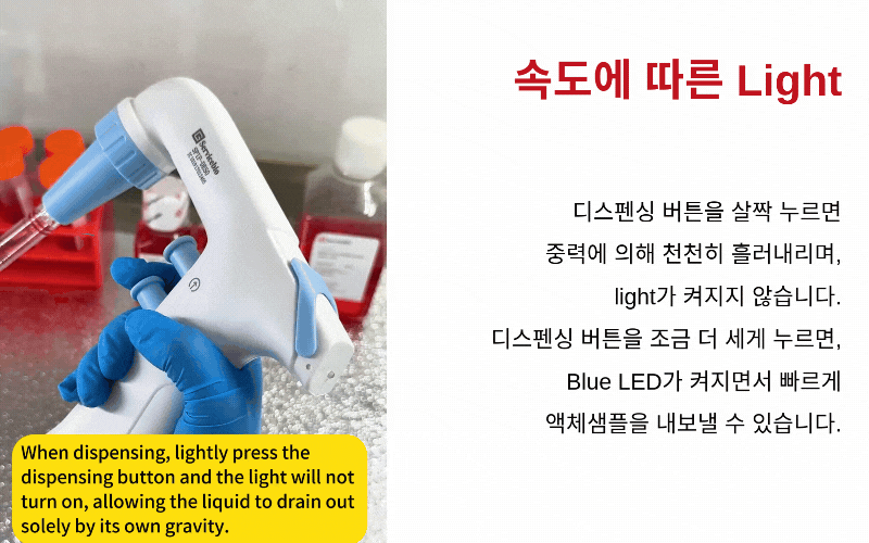 이 제품(SPIP-DE50) 은 일체형 디자인을 채택하여 컴팩트하고 사용이 편리한 형태로 설계되었습니다. 1mL에서 100mL까지의 플라스틱 또는 유리 혈청 피펫 및 파스퇴르 피펫과 호환이 가능합니다. 또한, 액체의 흡입 및 배출 속도는 사용자가 가하는 압력(중력 배출 포함)에 따라 조절할 수 있습니다.