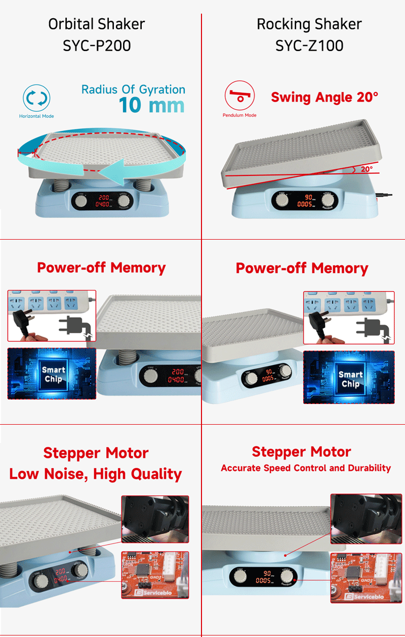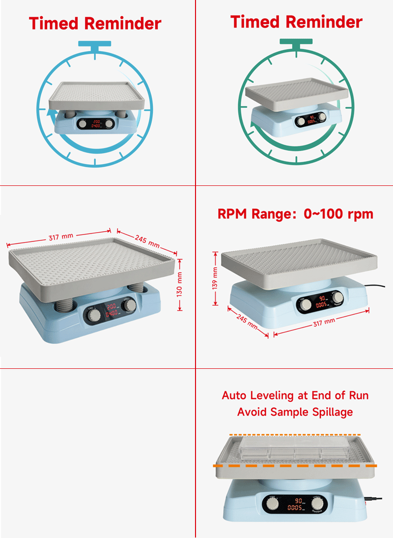 The shaker(rocker) is widely used in Western experiments such as blocking of blotting membranes, antibody incubation, washing, fixation, staining, and destaining of electrophoretic gels; it can also be used for shaking liquids in various centrifuge tubes, multi-well plates, Petri dishes, and culture bottles, mix well.